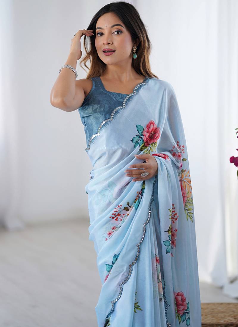 | Product Name | Sky Blue Chinon Silk Blend Print Work With Mirror Work Border Designer Saree | |
