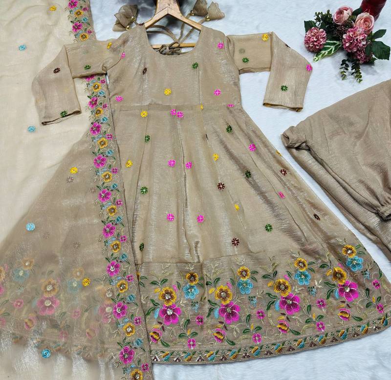 Plus size beige embroidered anarkali gown set stitched