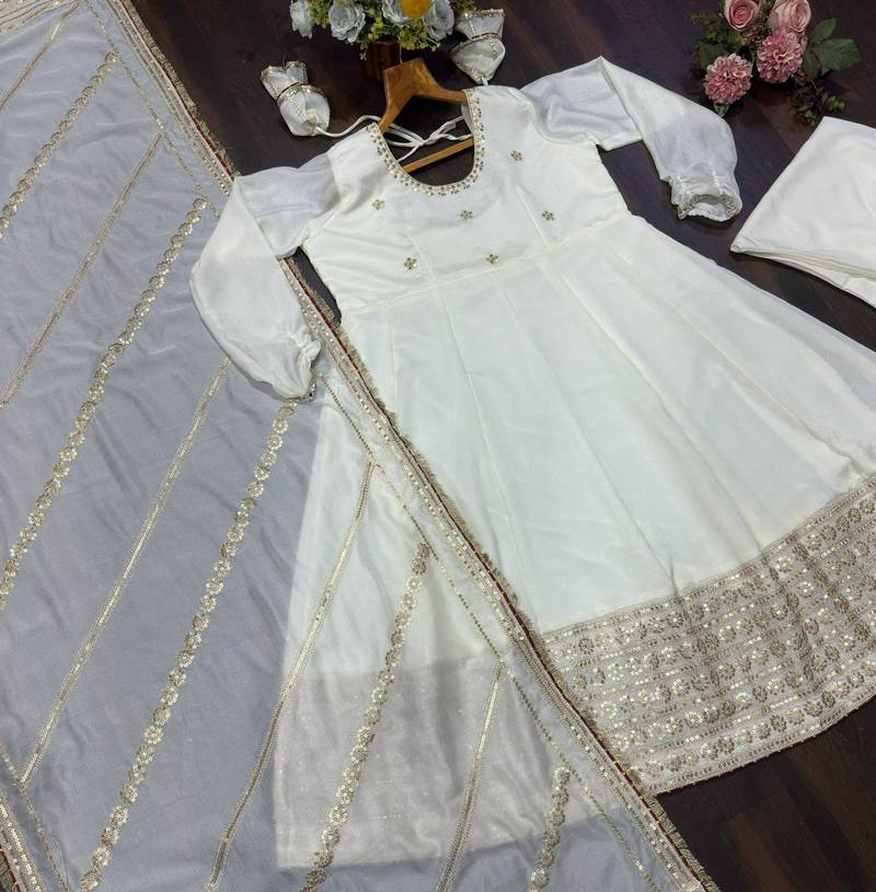 Off white chinon silk party wear suit set stitched