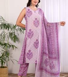 Yash Gallery Women's Cotton Floral Print A Line Kurta With Pant And Duptta (Lavender)