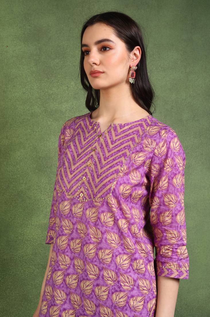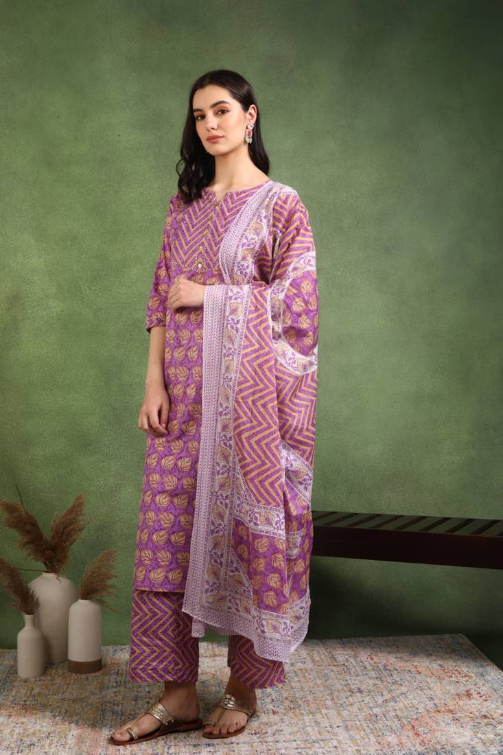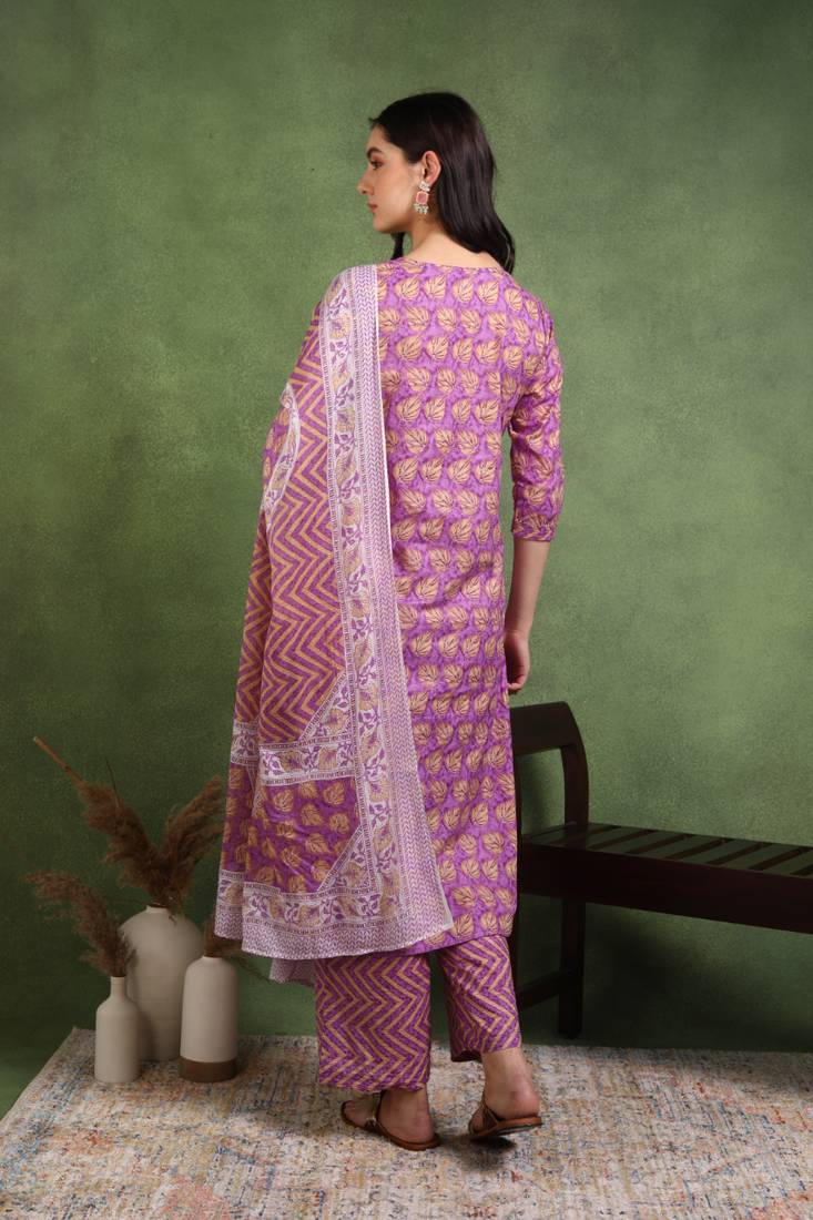 Step Into A World Of Elegance And Comfort With Our Beautiful Lavender Cotton Buta Print A Line Kurta. Expertly Crafted From 100% Premium Cotton, This Calf Length Kurta Offers The Perfect Blend Of Style And Comfort, Making It An Ideal Choice For Both Casual Outings And Festive Occasions. The Charming Buta Print, Inspired By Traditional Designs, Adds A Touch Of Cultural Flair While Ensuring You Stand Out In Any Crowd. With Its Striking V Neckline And Flattering A Line Silhouette, This Kurta Not Only Enhances Your Figure But Also Offers Ease Of Movement, Ensuring You Feel As Good As You Look. Designed With Thoughtful Features, This Exquisite Kurta Comes With 3/4th Sleeves For Added Comfort And Style. It Is Paired With A Comfortable Elastic Bottom That Keeps You At Ease Throughout The Day. The Included Coordinating Dupatta Adds An Extra Layer Of Elegance, Making This Ensemble Perfect For Pairing With Your Favorite Accessories Or Wearing On Its Own For A Fresh, Chic Look. Available In A Lovely Lavender Hue, This Outfit Is Versatile Enough To Coordinate With A Variety Of Footwear And Jewelry, Providing Endless Styling Options. Caring For Your Yash Gallery Kurta Is A Breeze—Simply Hand Wash In Cold Water And Hang To Dry To Maintain The Vibrant Colors And Intricate Detailing Of The Fabric. Each Piece Is Handcrafted With Love And Attention To Detail, Ensuring You Not Only Wear A Beautiful Garment But Also Own A Unique Work Of Art. Explore The Charm Of Traditional Craftsmanship With A Modern Twist, And Elevate Your Wardrobe With This Stunning Cotton Buta Print Kurta Today!