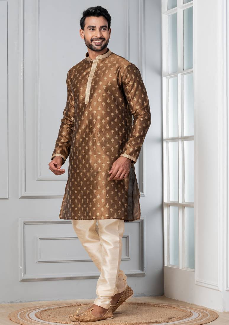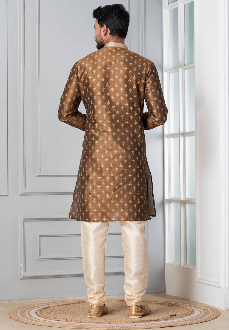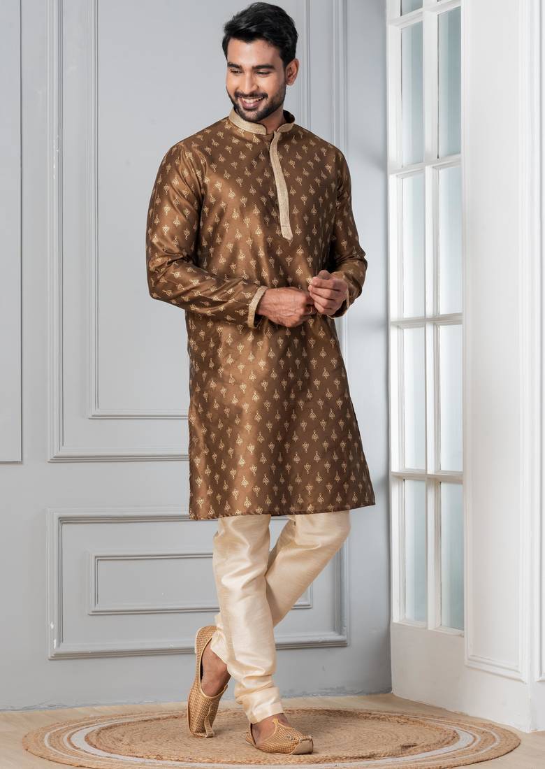 | Product Description | Step Into Timeless Elegance With This Men Brown Printed Dupion Silk Kurta For Festive, Reception, Weddings, Designed To Bring Out Your Refined Traditional Charm. Crafted From A Premium Dupion Silk Fabric, This Set Ensures All Day Comfort While Maintaining A Crisp, Structured Look. |