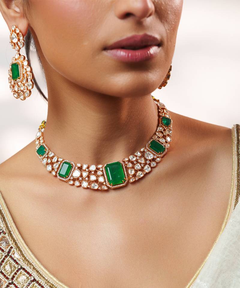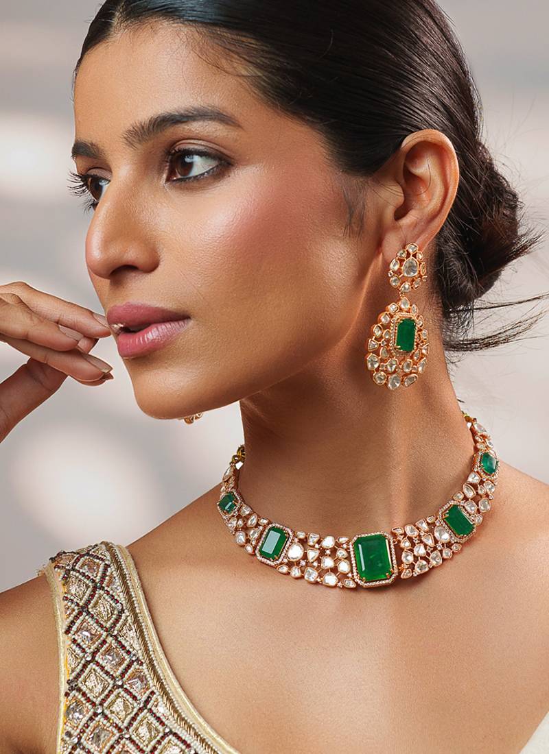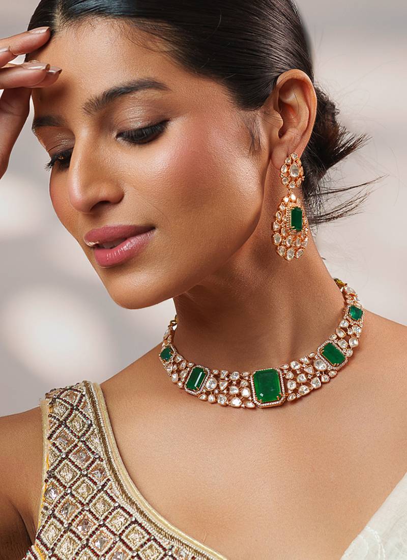 | Product Description | This Gold Plated Kundan Green Stone Choker Necklace Set Exudes Regal Elegance And Timeless Charm. Adorned With Beautifully Set Green Stones, It Showcases Intricate Craftsmanship And A Radiant Finish. Perfect For Weddings, Festive Occasions, Or Special Celebrations, It Adds A Rich Pop Of Color And Sophisticated Allure To Any Traditional Ensemble.