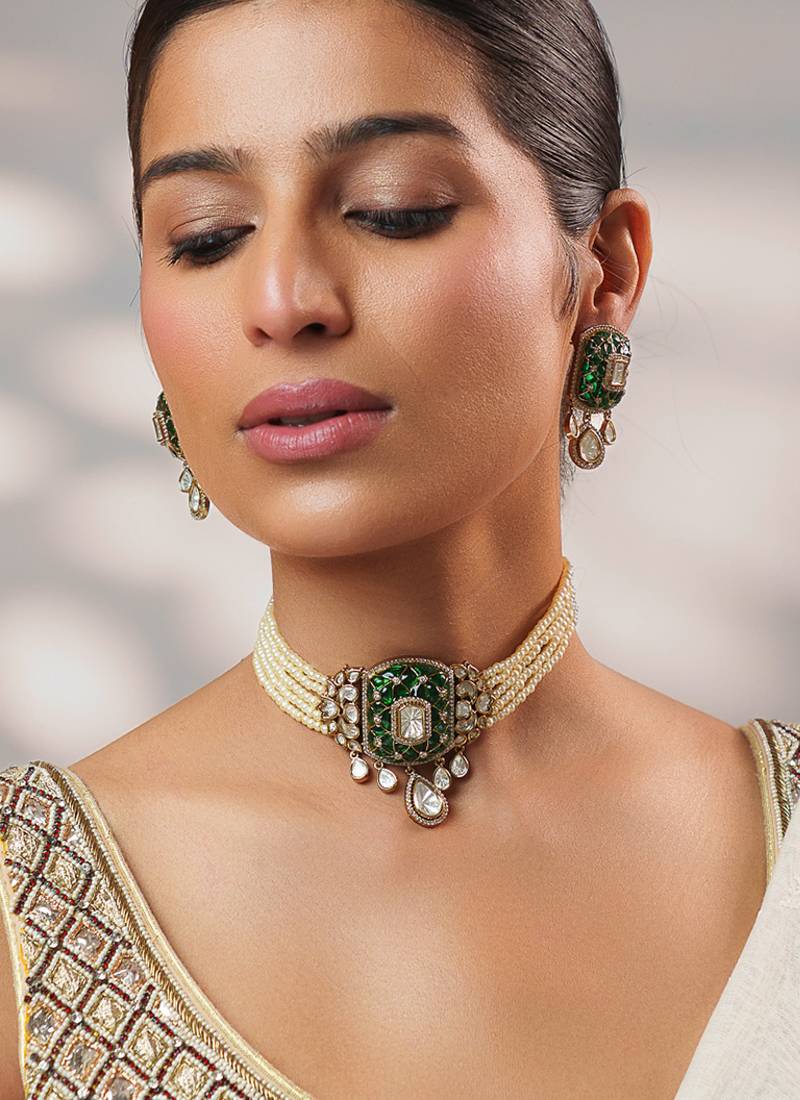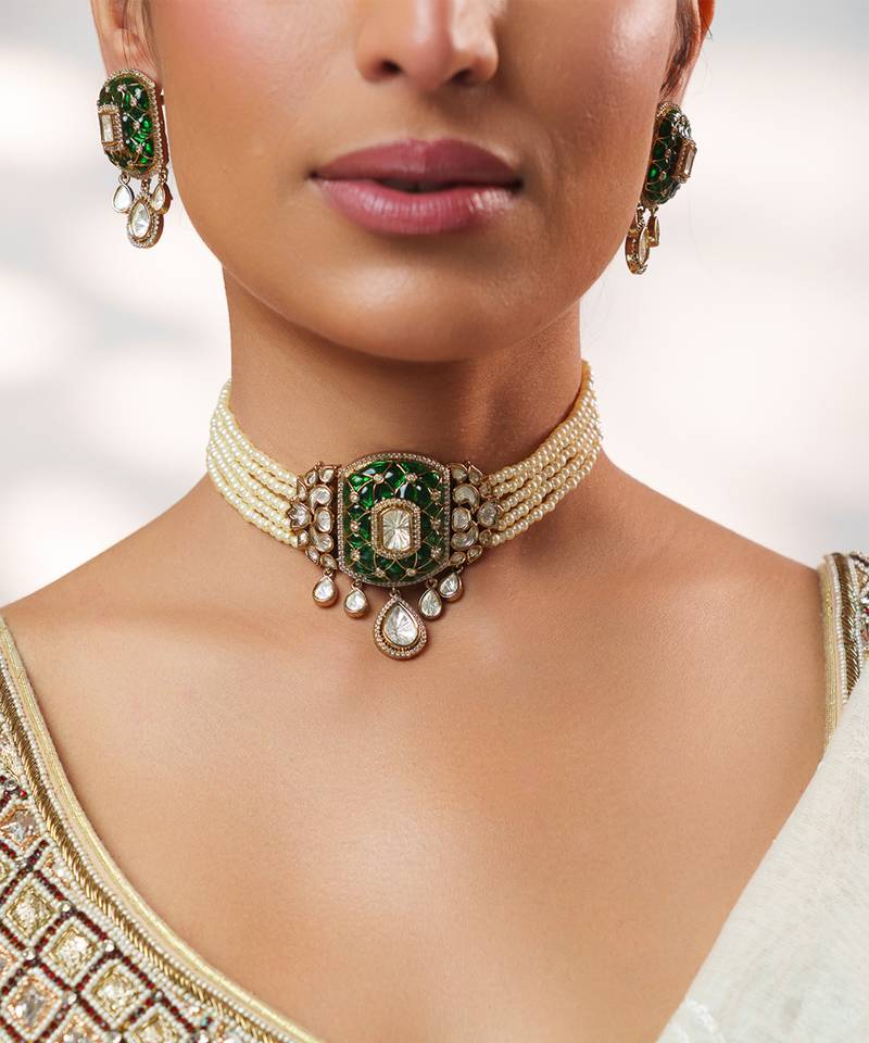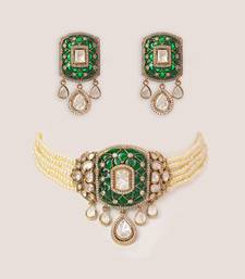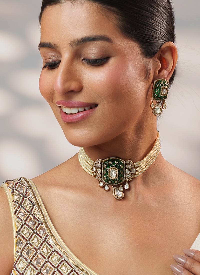 | Product Name | Two Tone Plated Kundan Green Stone Choker Necklace Set | |