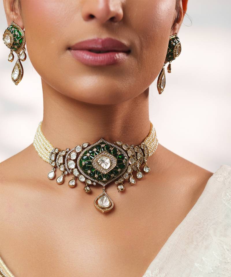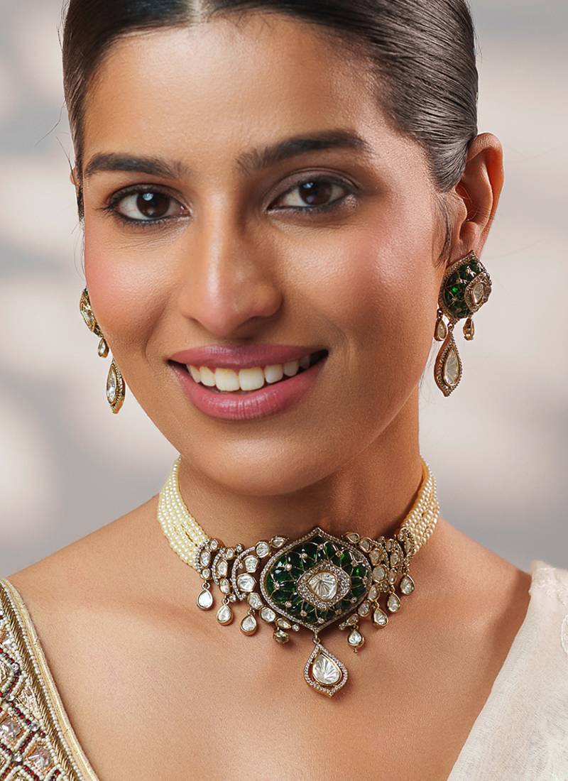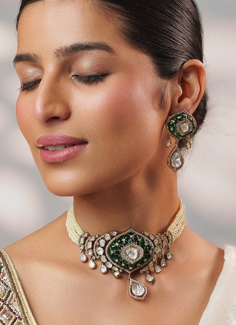 | Product Name | Two Tone Plated Kundan Green Stones Choker Necklace Set | |